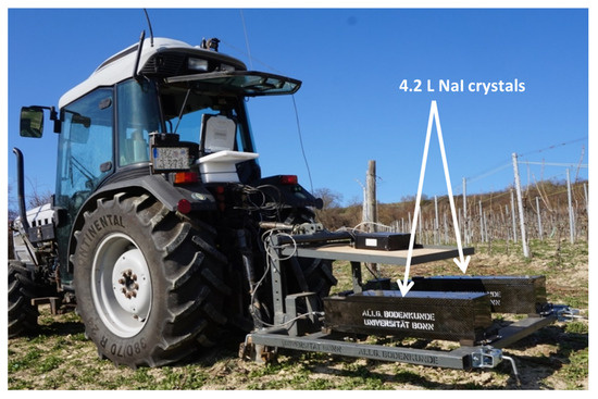 The gamma-ray spectrometer used in this study (type “RSX-1”) was manufactured by Radiation Solutions Inc. (Mississauga, ON, Canada). It consisted of two 4.2 l NaI(Tl) crystals which were mounted to the tractor’s three-point linkage via a steel frame that has been constructed at the University of Bonn for this purpose. The two crystals were linked with an advanced digital spectrometer (ADS) console so that the captured gamma decay energy pulses were synchronously processed and transformed into a spectrum with 1024 channels (Figure 1). Positioning data were provided by an internal GPS module with an external antenna.