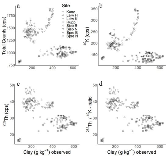 Clay content (g kg−1) versus gamma ROIs for the entire dataset: (a) total counts (cps); (b) K-40 (cps); (c) Th-232 (cps); (d) Th-232/K-40-ratios.