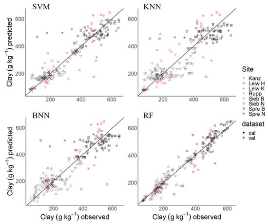 Predicted and observed values of cross-validation (cal) and test set validation (val) for clay content from site-independent regression models. SVM: Support Vector Machine; KNN: k-Nearest Neighbor, BNN: Bayesian regularized neuronal network; RF: Random Forest.