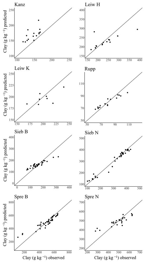 The aim of a site-independent model is an appropriate texture prediction at a given site that is capable of capturing a given in-field soil heterogeneity. For this site-specific evaluation, the best model, i.e., calibrated by RF, was chosen. Therefore, the regression parameters of the site-independent RF model were evaluated for each vineyard individually. Here, the RF model revealed variable results (Table 4). The model performed well for the vineyards Sieb B, Sieb N, Spre B, and Rupp with R2 = 0.88–0.97, RMSE = 51.1–19.0 g kg−1, and RPIQ = 2.06–9.24. In contrast, the vineyards Leiw, Kanz, and Spre N were predicted less satisfactorily, with low–mediocre accuracy (R2 = 0.40–0.79) and model robustness (RPIQ = 0.61–1.79). A trend towards better performance of the site-independent model became visible for the sites with larger heterogeneity (i.e., coefficient of variation; Table 2) of measured clay content. This is not surprising because a larger variation in target values is considered to be beneficial for regression modelling [].