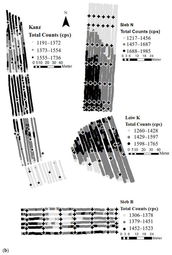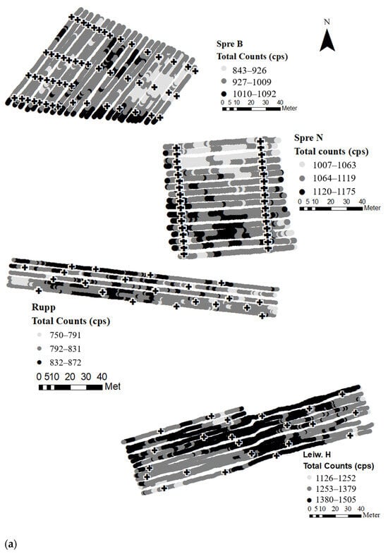 To explore the full extent of clay content variability, the study sites were systematically sampled for reference analyses (“ground truth”). Preliminary gamma spectrometry surveys were conducted for pattern recognition and subsequent reference sampling, with the same spectrometer setup as described in Section 2.3, but “on-the-go” at 0.7–1.4 m s−1 driving velocity. All soil samples were taken from the topsoil with an Edelman drill with three drills per sampling point. Clay content was determined as part of the texture analysis by the combined sieve and pipette method []. Soil moisture content was determined gravimetrically in order to correct the gamma counts with the IAEA factor [].