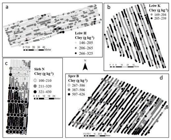 While the spatial distribution of clay content for the vineyard Spre B was also predicted with reliable accuracy, predictions for Leiw H and Leiw K were less successful (Figure 6).