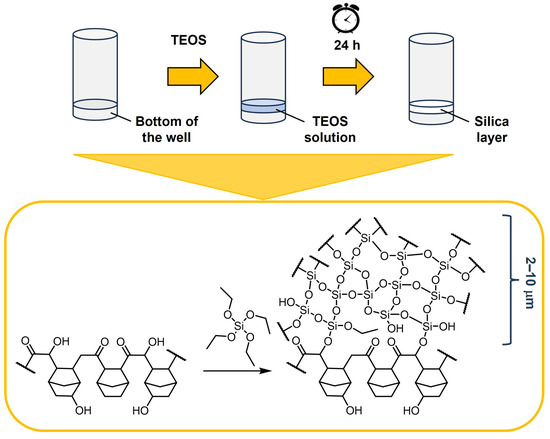 In the second step of the surface modification, the formation of a silica thin-layer was attempted using the commonly applied condensation method of tetraethyl orthosilicate (TEOS) monomers in aqueous media [44]. These experiments were carried out by incubating the pretreated well bottoms in a 200 µL solution of isopropyl alcohol containing 3 V/V% TEOS and 0.5 V/V% water. The reaction was incubated for 24 h at room temperature. As a result, 2–10 µm-thick silica layers formed. The optical properties of these plates were studied as a function of the layer thickness. Unfortunately, the silica coating strongly decreased the light transmittance of the plates (additional information can be found in the Supplementary Materials). This adverse effect was observed even in the case of the thinnest (2 µm) coating (Figure 2).