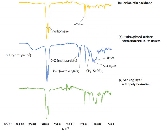 Part (b) refers to the polarized surface after introducing the TSPM linkers. The broad signal above 3000 cm−1 indicates the appearance of –OH groups. The other new peaks in the middle spectral region identify the linker. The characteristic peaks for the surface-attached alkoxysilane unit (1000–1110 cm−1 for Si–OR, 1265 cm−1 for Si–CH2–R and 1435 cm−1 for –CH2–Si(OR)n) and those of the methacrylate unit (1640 and 1720 cm−1 for C=C and C=O, respectively) are present [51,52].