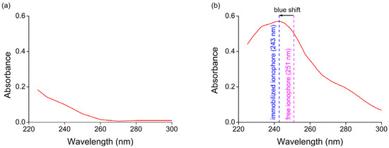 UV-absorbance spectrum of the pretreated (polarized, linker-functionalized) microplate well (a) and that of the sensing microplate containing the covalently immobilized ionophore 1 (b).