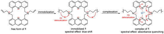 In the case of covalent immobilization or upon complexation with a cation, the ability of the N-atoms of the receptor unit to donate electrons decreases significantly and the conjugation of their lone pairs with the π–system of the chromophore induces a change in the absorbance intensity, while the absorption spectrum shifts in the direction of shorter wavelengths.