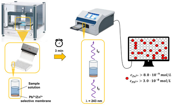 Our work provides an ultrafast sensing device with a high potential to replace conventional instrumental analytical methods in the high-throughput specific monitoring of dissolved Zn2+ and Pb2+. The designed covalently functionalized UV-transparent microtiter plate is compatible with any kind of generally applied reader spectrophotometers, as well as with conventional laboratory automation, e.g., liquid-handling workstations, plate transferring robots, multichannel pipetting devices. Thus, there is the possibility for its practical adaptation and full automation. The applicability of liquid samples for HTS was shown even for real samples, while satisfying the current requirements regarding the detection limits. In addition, we present a new procedure for the covalent modification of commercially available cycloolefin microtiter plates, which can also serve as a starting point for the future development of not only sensing devices, but various separation and assay tools for high-throughput experimentation. The main advantages and drawbacks of the proposed method are summarized in Figure 14.