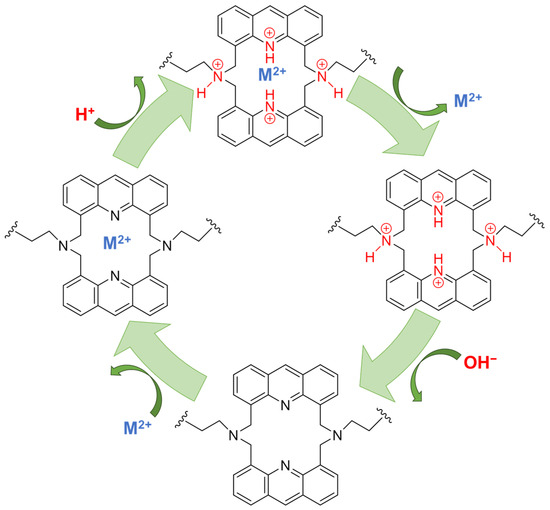 In the pH range from 5.0 to 7.5, constant absorbance was measured in aqueous samples. This range of pH values is the primary pH levels found in environmental and biological samples. As the pH drops below 5.5, the basic acridine-N of the sensor molecule (1) becomes protonated, which reduces the stability of the host–guest complex. This feature enables the regeneration process described in Section 3.2. The pH level above 7.5 is irrelevant as it leads to the precipitation of hydroxides of the favored cations.