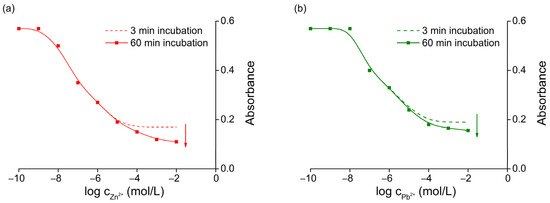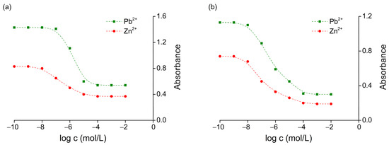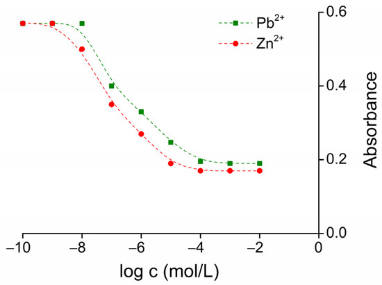 Initially, titration was carried out by using single-component aqueous solutions of Zn2+ and Pb2+ in a wide concentration range. The obtained calibration curves can be seen in Figure 8.