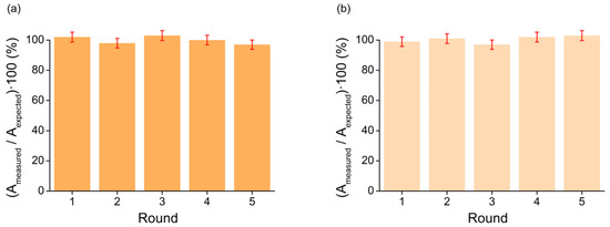 In order to investigate the reusability of the reported sensing device, five parallel single-component aqueous samples with an identical concentration of Zn2+ (1.0 × 10−6 mol/L) were measured (part a of Figure 10). Moreover, to validate the reusability, repeated measurements were also carried out with real samples (part b of Figure 10; detailed information regarding the sample composition can be found in the Supplementary Materials). The regeneration procedure detailed in Section 3.2 was carried out between each measurement.