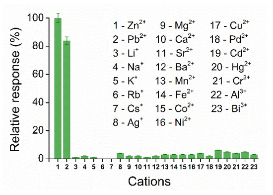 It can clearly be seen that no significant change (within 5.0%) was caused, in the optical response, by the potential competing metal ions. Since Pb2+ is rarely expected to be co-present with Zn2+ in biological samples, this competition can only hinder the practical applicability in environmental monitoring. This might especially be the case for samples from mining areas or the close environment of landfills. This observation also indicates that the sensor molecules strongly coordinate the preferred ions even in the presence of Cd2+, Pb2+, Hg2+, Co2+, Ni2+ and Cu2+, which are considered typical competitors in similar chemosensing applications due to their soft cationic character.