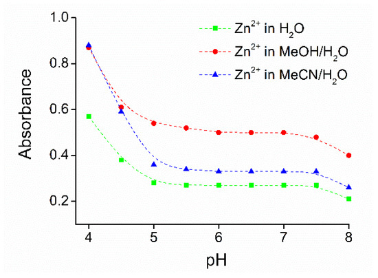 The pH-dependence of the optical response toward 1.0 × 10−6 mol/L Zn2+ at 243 nm in the case of aqueous samples; sample in methanol-water (9:1) and in acetonitrile-water (1:1) solvent mixtures (in organic solvents, the reported pH values refer to the initial pH of the aqueous part of the mixture).