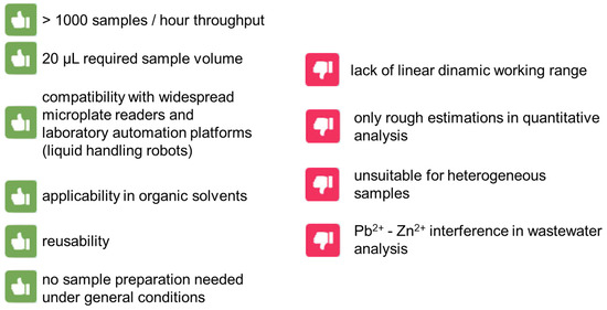 The reported works on the selective optosensing of simple ions with a potential of reaching high-throughput were collected to put the obtained results into a context and support the evaluation of the properties of the proposed microplate-format sensing device (Table 3). In terms of instrument compatibility, the collected works are all suitable for measurements with a plate reader, which facilitates the speed of sample screening.