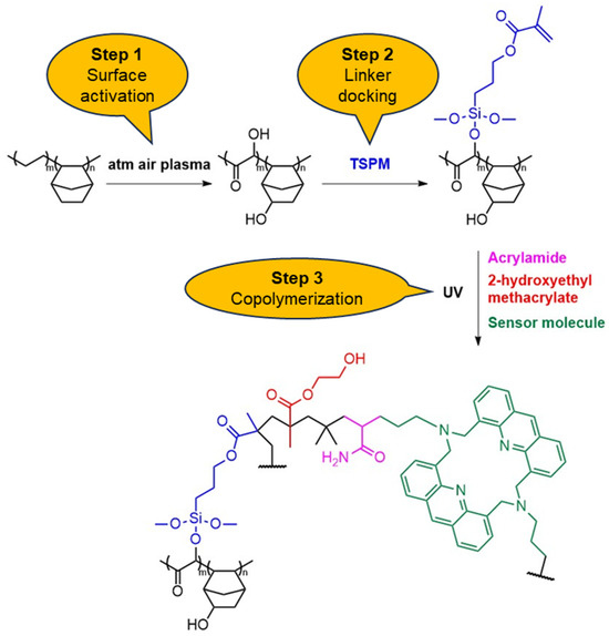 Procedure for functionalizing the polymer surface of the optosensing microplate device. (Only one of the possible chemical structures of the resulting polymer is shown. Constitution of the monomers, as well as the chemical and steric microenvironment of the sensor molecules, can vary diversely within the sensing membrane).