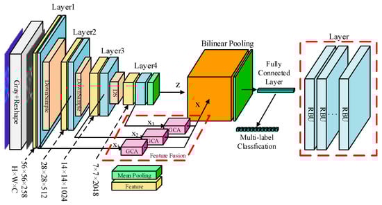 Using two low-rank matrices, and , to approximate avoids the direct computation of the outer product of the two features as in the original bilinear pooling method. This reduction in computation and parameters decreases the parameter count from to . It can be observed that the parameter count is controlled jointly by the joint embedding dimension m and the channel numbers of the two input features. Therefore, while ensuring the features remain unchanged, it is possible to attempt multi-channel merging to reconstruct feature parameter scales, reduce the number of channels, and increase computational complexity to decrease parameter count, ensuring efficient network operation.