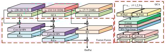 First, the low-, medium-, and high-level features x1, x2, and x3 of the received signal are extracted from different layers of the backbone network. Feed the features individually into GCA, where H, W, and C represent the height dimension, width dimension, and channel dimension of the feature, respectively. Since the input feature of the neural network is the time–frequency feature plot of the signal, the width dimension and height dimension of the feature can be regarded as the time and frequency dimensions of the feature. Then, in the GCA, the time–frequency dimension weight information of multi-scale modal features is extracted and weighted, and finally, the multi-scale modal features are fused.