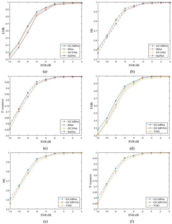 Moreover, as shown in the experimental results in Figure 4d-f, integrating the proposed modules into the VGG network as the backbone structure resulted in a 7% improvement in EMR and approximately 9% improvement in HS under low SNR conditions, with improved balance in the F-Measure, further demonstrating the reliability of the proposed modules in this paper.