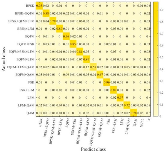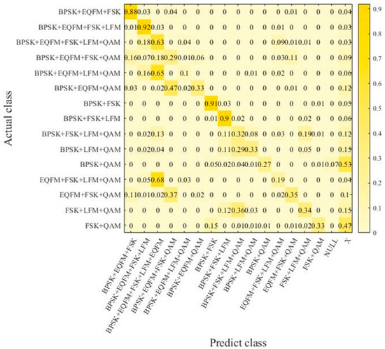 In Figure 6, the EMR for signals from the supplementary dataset is only 47.2%, while the HS reaches 84.6%. The supplementary dataset contains a significantly higher number of mixed-signal samples compared to the original dataset, resulting in a noticeable decrease in the EMR due to the increased complexity of mixed samples. However, the HS approaches that of the original dataset. Considering the EMR, HS, and analysis of the confusion matrix, the model’s ability to recognize signal types in the supplementary dataset is comparable to that in the original dataset. However, there is a discernible limitation in distinguishing between different types of signal combinations, particularly affecting the recognition performance when QAM and BPSK signal types coexist. Therefore, under the same experimental conditions, introducing supplementary dataset samples with a 40:1 ratio in the training set enhances the model’s learning of different types of combinations and leads to a new supplementary confusion matrix.
