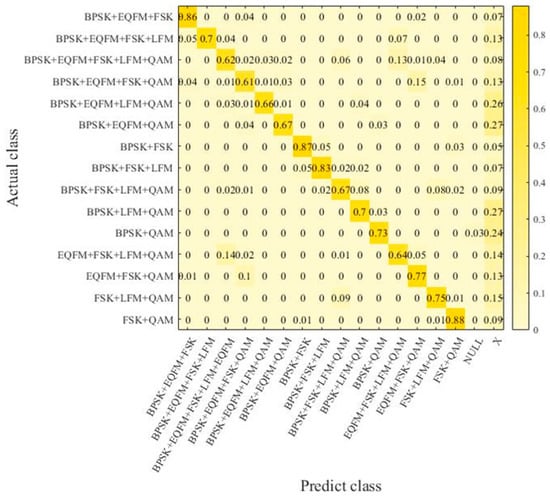 Figure 5 shows the confusion matrix obtained by randomly selecting 80 signal samples for each mixed type from the original dataset at various signal-to-noise ratios (SNRs). It reveals that the EMR for signals reaches 84.6%, with EMR exceeding 92% for single signals and nearing 80% for multiple signals. The HS is concluded to be 91.1%. It is also observed that as the number of coexisting mixed signals within a sample type increases, the model’s ability to recognize signal types weakens. This is due to the increased number of signals under the same noise conditions, causing energy dispersion in the time–frequency domain and resulting in blurred features that reduce separability and increase recognition difficulty.