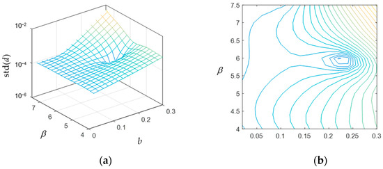 Standard deviation of the tip displacement amplitude (d) at different force angles, as a function of the beam geometry (): (a) surface plot and (b) contour plot.