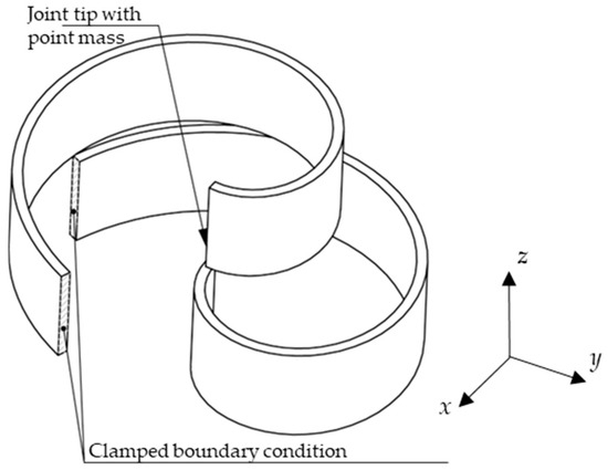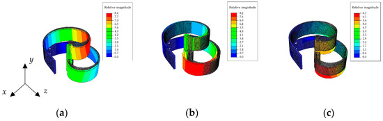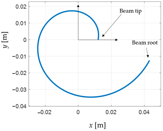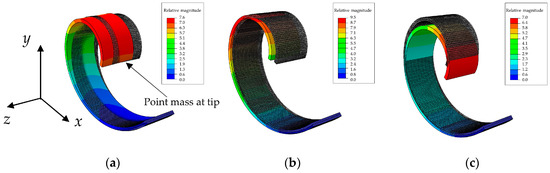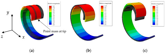 Figure 4 shows the first three mode shapes of the massless spiral beam with concentrated mass at the tip. The first mode, as depicted in Figure 4a appears to have a different shape and dynamic nature, as it occurs out-of-plane (in the z direction orthogonal to the x–y plane) at a relatively different frequency. Then the two bending mode shapes, i.e., mode 2 in Figure 4b and mode 3 in Figure 4c, possess quite the same natural frequency, although they are along different directions.