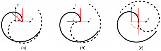 The main conditions to be satisfied are that the two beams should be in the same plane and be coupled at their tips. This is because they both have an orientationally-equal stiffness at their tips in the x–y plane, so this property is kept in the new configuration as well. It can be then reasonably deduced that the two beams can be oriented with respect to each other, as shown in Figure 6, which depicts some possible relative orientations of two identical spiral beams.