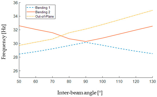 As can be seen in Figure 7, the two bending natural frequencies meet at a 90° inter-beam angle. Moreover, the bending natural frequencies seem to be in a quite symmetric trend (increasing/decreasing in an opposing fashion with the inter-beam angle getting farther from 90°), while the out-of-plane natural frequency has an increasing trend over the whole range of the angle presented in Figure 7. According to Figure 7, the out-of-plane mode jumps to the third position (i.e., the highest frequency) at about a 75° inter-beam angle, making the lower angles less suitable for the setup, as the out-of-plane mode is more likely to interfere with the planar vibration of the beam.