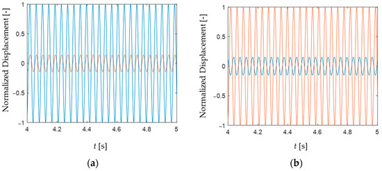 Dynamic analysis of the beams tip, showing the normalized tip displacement at steady-state (i.e., after 4 s) for a base excitation of 0.2 mm along (a) the x direction and (b) the y direction. The blue line is the response along the x direction, and the red line is the response along the y direction.