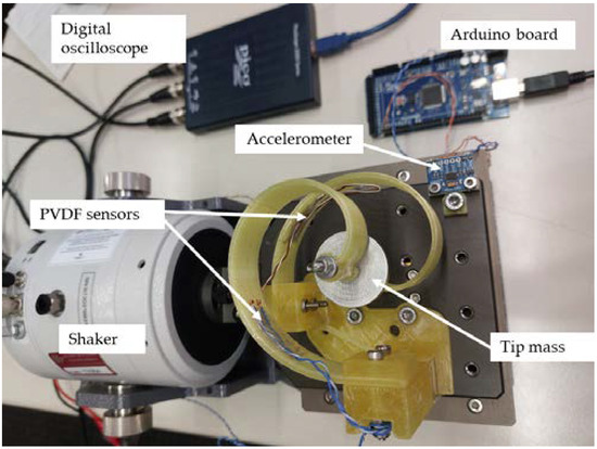 A test setup was finally designed and manufactured based on the results of several finite element simulations. The experiments were conducted using an electro-dynamic shaker as an exciter, one PVDF sensor attached to each beam, an accelerometer sensor at the excited base, and a digital oscilloscope to measure the piezoelectrically generated voltages. The PVDF sensors were used to measure the open-circuit voltage generated due to the input vibration in different directions.