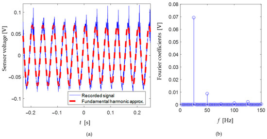 The output voltage was acquired by the digital oscilloscope that simultaneously calculates the waveform root mean square (RMS) value. Thus, all of the voltage measurement results presented in this paper were obtained from this device. Figure 17a shows the recorded signal from the digital oscilloscope when the excitation was at resonance (25 Hz) and the relative orientation of the setup was 90°. Figure 17b shows the Fourier coefficients of the signal in Figure 17a. It can be seen that the system response is predominantly harmonic at the excitation frequency, and the amplitude of higher harmonics is negligible.