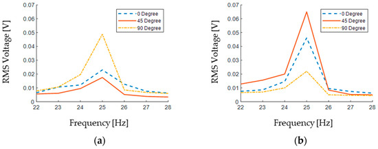 Since there is a 90° angle between the two beams, one could expect the results of the lower beam to be equal to those of the upper beam when the setup is rotated 90°. The obtained results prove this. For instance, the maximum RMS value of the output voltage of the upper beam in the 0° rotation is 0.023 V (blue dashed line in Figure 18a), and this is quite similar to that of the lower beam in the 90° setup rotation (yellow dash-dotted line in Figure 18b), which is 0.022 V.
