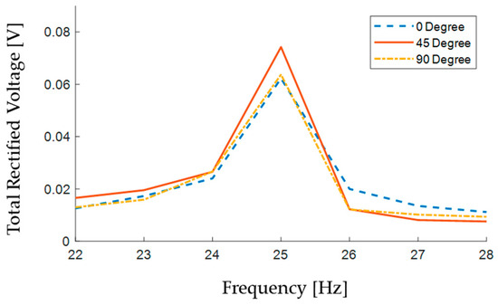 Assuming the two generated AC voltages undergo a full-wave rectification to DC, they will ideally result in VDC ≈ 0.9VRMS. The two piezoelectric patches could then be connected in series to charge a capacitor for on-demand use (i.e., for acquiring sensor data and wireless data transmission). To preliminarily verify the overall performance of the coupled PVDF design at different excitation directions, the AC–DC converted voltages of the two patches are added together to obtain an estimate of the total produced DC voltage. This is plotted in Figure 19, and it can be seen that the estimate for the total generated voltage does not vary much with respect to the excitation direction.