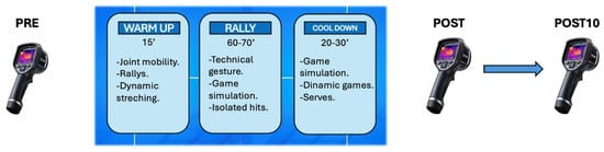 The players participated in the same training group, led by the same coach, with a duration on the court of 3 ± 1 h with a common training pattern. The training consisted of a tactical part and game simulations combined with isolated hits (Figure 1). The study was designed with PRE, POST and POST10 measurements 10 min after training (Figure 1). Thermographic images were taken PRE and POST. Overall pain perception was measured using a 15 cm visual analogue scale (VAS) (0 no pain and 15 maximal pain) at PRE and POST moments, calculating variation between POST and PRE (∆Pain) []. For the perception of fatigue, the adapted Borg scale (0 no fatigue/10 extreme fatigue) was used [], and variations were also assessed (∆Fatigue). The scales were shown to the participants, and they pointed to the score selected.