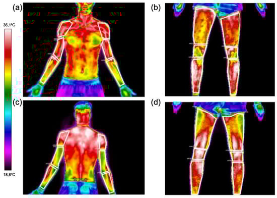 Regions of interest analyzed of (a) anterior upper limbs, (b) anterior lower limbs, (c) posterior upper limb and (d) posterior lower limb. Images shown were those of one male professional padel player in the post-exercise measurement moment.
