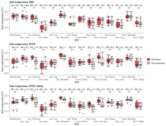 No differences between both sides were observed at PRE for any ROI (p > 0.05, Figure 3). In the POST moment, the differences were in four ROIs: anterior forearm (30.8 ± 0.4 °C vs. 29.1 ± 1.2 °C, p < 0.01 and ES = 1.9), anterior shoulder (31.6 ± 0.6 °C vs. 30.9 ± 0.6 °C, p < 0.05 and ES = 1.0), posterior arm (29.5 ± 1.0 °C vs. 28.3 ± 1.2 °C, p < 0.05 and ES = 1.0), and posterior forearm (30.8 ± 0.9 °C vs. 29.3 ± 1.6 °C, p < 0.05 and ES = 1.1). However, at the POST10 moment, differences were found in five ROIs; anterior arm (31.2 ± 0.5 °C vs. 30.6 ± 0.5 °C, p < 0.05 and ES = 1.2), anterior forearm (31.7 ± 0.6 °C vs. 30.5 ± 1.1 °C, p < 0.01 and ES = 1.4), anterior shoulder (31.8 ± 0.3 °C vs. 31.3 ± 0.5 °C, p < 0.01 and ES = 1.4), posterior arm (29.8 ± 0.8 °C vs. 28.7 ± 0.6 °C, p < 0.01 and ES = 1.5), and posterior forearm (30.8 ± 0.9 °C vs. 29.7 ± 0.9 °C, p < 0.01 and ES = 1.5) (Table 1).