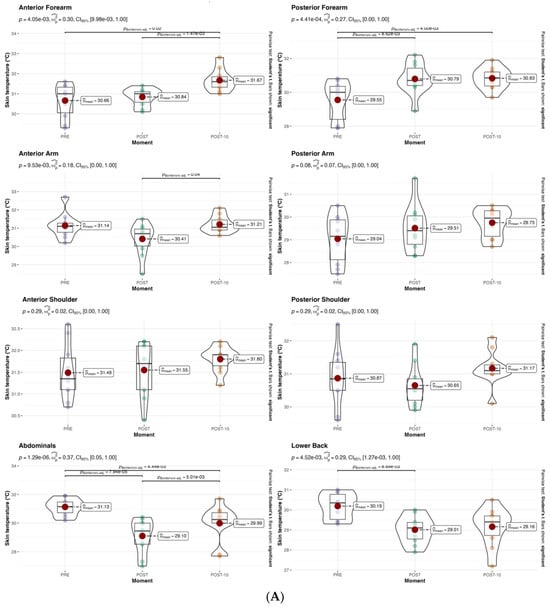 Tsk was higher at POST10 than at the PRE moment in the different regions analyzed, except the shoulder, abdominals, and lower back (p > 0.05) (Figure 4A). Regarding upper body, anterior forearm showed differences (PRE vs. POST10 and POST vs. POST10; 30.7 ± 0.8 °C vs. 31.7 ± 0.6 °C, p = 0.02 and ES = 1.4, and 30.8 ± 0.4 °C vs. 31.7 ± 0.6 °C, p = 0.0014 and ES = 1.7), posterior forearm (PRE vs. POST and PRE vs. POST10; 29.6 ± 1.2 °C vs. 30.8 ± 0.9 °C, p = 0.008 and ES = 1.4, 2nd 29.6 ± 1.2 °C vs. 30.8 ± 0.6 °C, p =0.004 and ES = 1.4), anterior arm (POST vs. POST10; 30.4 ± 0.8 °C vs. 31.2 ± 0.5 °C, p = 0.04 and ES = 1.1), abdominals (PRE vs. POST; 31.1 ± 0.6 °C vs. 29.1 ± 1.2 °C, p < 0.001 and ES = 2.1) (PRE vs. POST10; 31.1 ± 0.6 °C vs. 30.0 ± 1.3 °C, p = 0.004 and ES = 1.1) and (POST vs. POST10 29.1 ± 1.2 °C vs. 30.0 ± 1.3 °C, p= 0.005 and ES = 0.7), and lower back (PRE vs. POST; 30.3 ± 0.7 °C vs. 29 ± 0.7 °C, p = 0.005 and ES = 1.8).