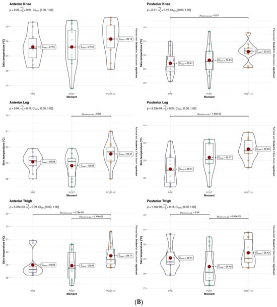 (A) Box plot of the differences between moments in the upper body (pre-training, post-training and post-training 10 min). (B) Box plot of the differences between moments in lower body (pre-training, post-training and post-training 10 min).