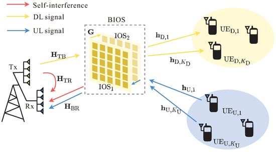 Consider a narrowband multi-input single-output (MISO) FD system comprising a BS, a BIOS, DL UEs, and UL UEs in Figure 1. We assume that all the UEs are single-antenna, employs transmit antennas, and has receive antennas. The BIOS is deployed significantly close to the BS to ensure the reflected signals are strong enough to efficiently suppress the SI signals, so we assume that there is no line-of-sight (LoS) path between the BS and UEs [28].