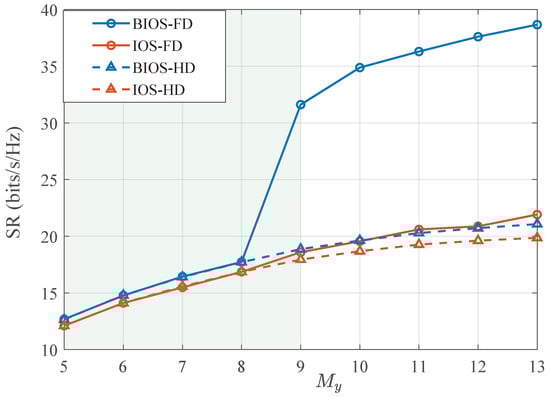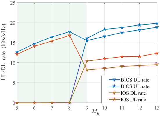 To further investigate the beamforming performance of the BIOS and IOS in FD systems, Figure 3 shows the detailed UL and DL rates of the BIOS/IOS-assisted system with different M. As can be observed, the system switches from the FD mode to the HD mode with . In this range, the data rate, i.e., the DL rate, consistently increases with M. This is because the expansion of the array scale provides higher degrees of freedom, thus enhancing the beamforming gain. However, when changes from 8 to 9, the DL rate unexpectedly decreases while the UL rate substantially increases. This is because the power of the cascaded signal generated by the BIOS/IOS is strong enough to facilitate effective SIC, thus leading to a trade-off between the SRM and SIC for beamforming. It is worth noting that, compared with the IOS-assisted system, the DL rate in the BIOS-assisted system is less affected due to the independent beamforming on both sides. Consequently, the SR performance of the BIOS-assisted FD system significantly surpasses that of the IOS-assisted system.