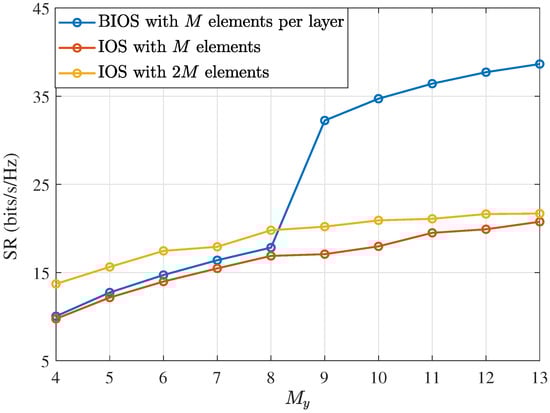 Furthermore, Figure 4 shows the performance comparison between the proposed BIOS and an IOS with the same scattering elements. As the element spacing is kept unchanged, the IOS with elements has a larger aperture size, it can be observed that the IOS with elements slightly outperforms the IOS with M elements due to the additional beamforming gain from the increase in the element number and the aperture size. Similarly, it outperforms the BIOS when is small for the same reasons. However, with the increase in , the performance of the IOS with elements remains significantly inferior to that of the BIOS due to the coupling between the reflected and refracted beams.