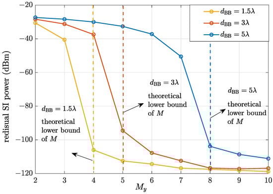 Finally, to visualize the SIC capability of the BIOS and verify the theoretical lower bound discussed in Section 4, Figure 5 shows the residual SI power as a function of in SISO FD systems with different . Specifically, the solid line represents the residual SI power, and the dashed line of the same color represents the theoretical lower bound of M for efficient SIC in the system with the same . It can be observed that the residual SI power with the proposed scheme monotonically decreases as M increases due to the beamforming gain. Meanwhile, despite the approximation, the theoretical lower bound calculated according to (37) is consistent with the simulation result.