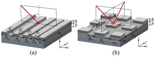 Two-dimensional (2-D) gratings are designed to have the same spacing with gx, gy = 400 nm and the same width with wx = 400 nm, and the length wy of the grating body is changed from wy = 400 to wy = 2000 nm, resulting in square and rectangular shapes, as exemplified in Figure 3.