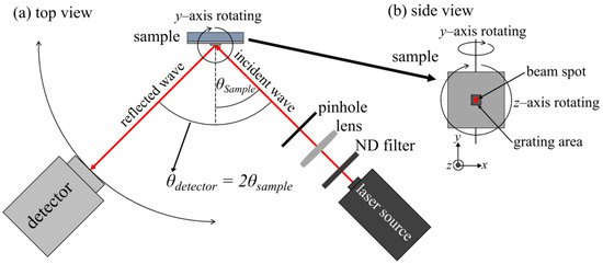 To assess the performance of the grating structures in exciting surface plasmons, a modified version of the home-built measurement setup [33] is employed, as depicted in Figure 2. The helium–neon gas laser (05-LHP-151, Melles Griot, Singapore) emits light at 632.8 nm and is shaped into a Gaußian beam with 0.7 mm diameter. The sample holder allows for automatic recording of reflection characteristics from 10° to 40° with an angular resolution of 0.2° and rotation about the normal to the chip’s surface. The coupling efficiency is then evaluated by recording the reflected beam intensity for varying excitation angles with a light detector (ANDO, Ando Electric Co., Ltd., Tokyo, Japan) rotating simultaneously at twice the sample angle.