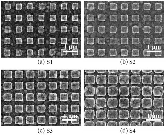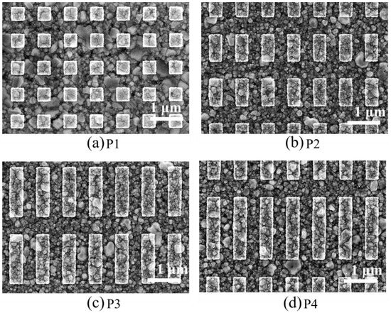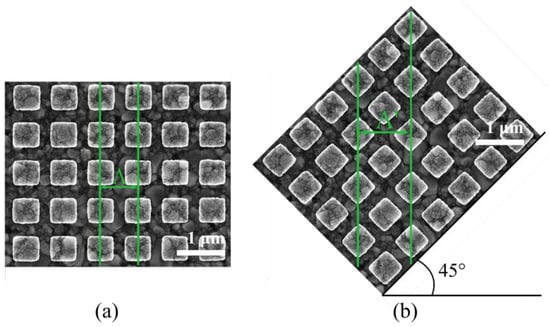 To investigate the performance parameters of 2-D gratings, symmetrical and non-symmetrical structures are produced. The latter structures feature consistent top and bottom spacings (g = 400 nm), equal width (w = 400 nm), and variable grating body lengths of 400 nm, 800 nm, 1600 nm, and 2000 nm, resulting in both square and rectangular shapes, as schematically shown in Figure 1b. The symmetric 2-D grating structures are designed with a square geometry, maintaining a constant period of 800 nm while introducing variations in the grating size. The utilization of e-beam lithography plays a crucial role in achieving this design, employing dose factor techniques to create a spectrum of grating sizes. This technique involves adjusting the dose of the electron beam (beam energy 10 keV, dose 55–70 μm/cm2), where higher energy doses lead to the formation of wider gratings.