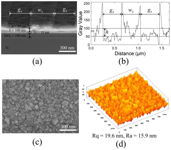 (a) SEM cross-section of the grating structure showing the dimensions h, b, wx, and gx. (b) Surface profile of the grating structure with a 400 nm width (wx) and a 400 nm gap (gx). (c) SEM image of the silver surface produced by thermal evaporation after lift-off process. (d) Surface roughness calculated from the SEM image using ImageJ with Rq = 19.6 nm and Ra = 15.9 nm.