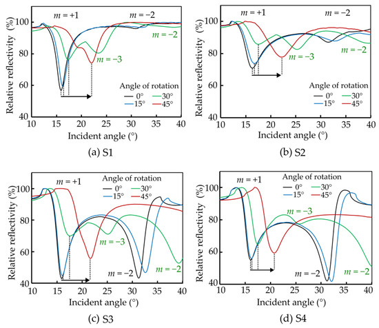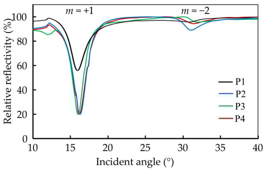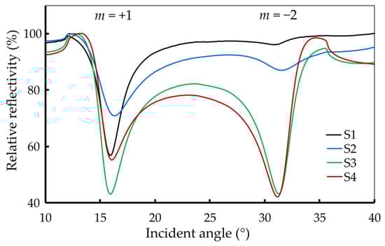 The relative reflection results for samples S1–S4 exhibit plasmon excitation at approximately 16.1° and 31.2° for the +1 and −2 orders, respectively.