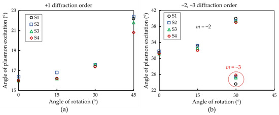 Figure 10 illustrates the relationship between the plasmon excitation angle and the rotation angle of the structure for all observed diffraction orders, indicating a general increase in the plasmon excitation angle with larger rotation angles. At an angle of rotation of 30°, the m = −3 order is observed in addition, and, consequently, it is depicted in Figure 10b as well. The symmetry of the structure implies that, beyond 45° rotation, the structural configuration repeats, reverting to its initial form.