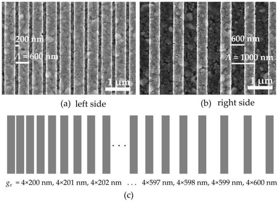 The 1-D gradient grating structures are fabricated with specific parameters to investigate their optical properties and maintain a consistent grating size (w) of 400 nm. However, the distance between the grids exhibits variability, ranging from 200 to 600 nm, with increments of 1 nm occurring every four grids. This design creates a grating period (Λ) that begins at 600 nm and ends at 1000 nm along the grating area, as shown in Figure 11. The entire grating area covers 1.3 mm2.