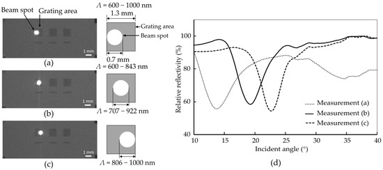 To assess the reflectivity properties, the optical measurement system is used. However, it is crucial to note that the laser spot utilized for the optical measurements is strategically positioned at three distinct points within the grating area. The center of the laser beam is centered at 0.35 mm, 0.75 mm, and 0.95 mm from the edge corresponding to the side of the grating structure with a shorter grating period, as shown in Figure 12.