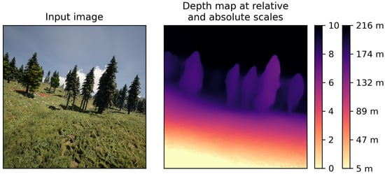 Nevertheless, existing unsupervised MDE methods suffer from two fundamental problems that prevent them from being applied to flight scenes. The first is the scale problem, which arises from the inherent ambiguity of MDE []. Without the use of GT depth or stereo image pairs, no real-world scale information is introduced into the estimation process, so only relative depth maps can be generated, where the pixel values only represent the far and near relations between objects, but have no physical meaning. In absolute depth maps, however, the pixel values have a physical unit (such as meters), and indicate the real distance between points and the camera, as shown in Figure 1. Without the ability to obtain absolute depth, it can be quite difficult for UAVs to perform the tasks that rely on this kind of information, such as obstacle avoidance, autonomous landing and terrain following, and their flight safety may even be compromised.